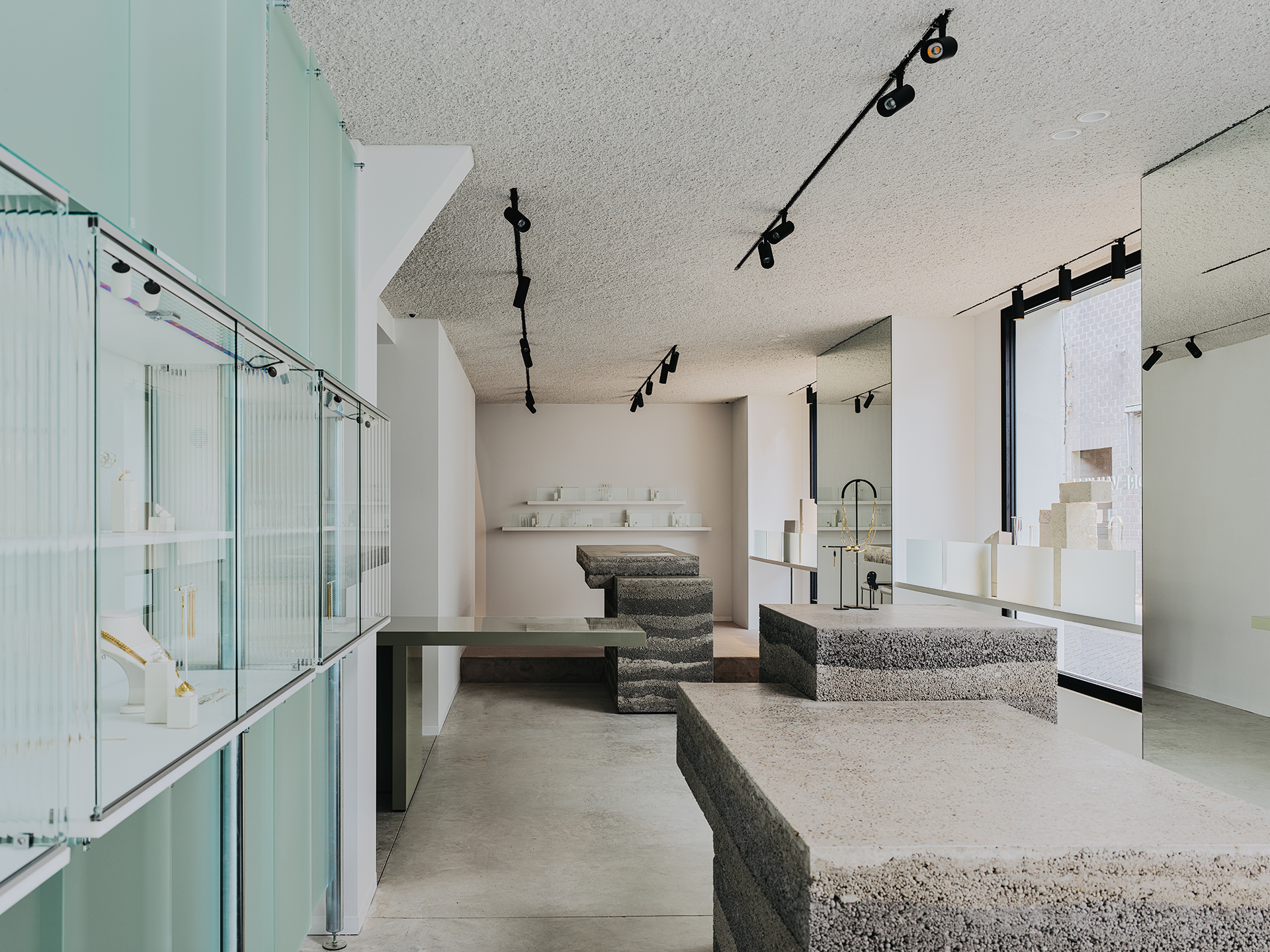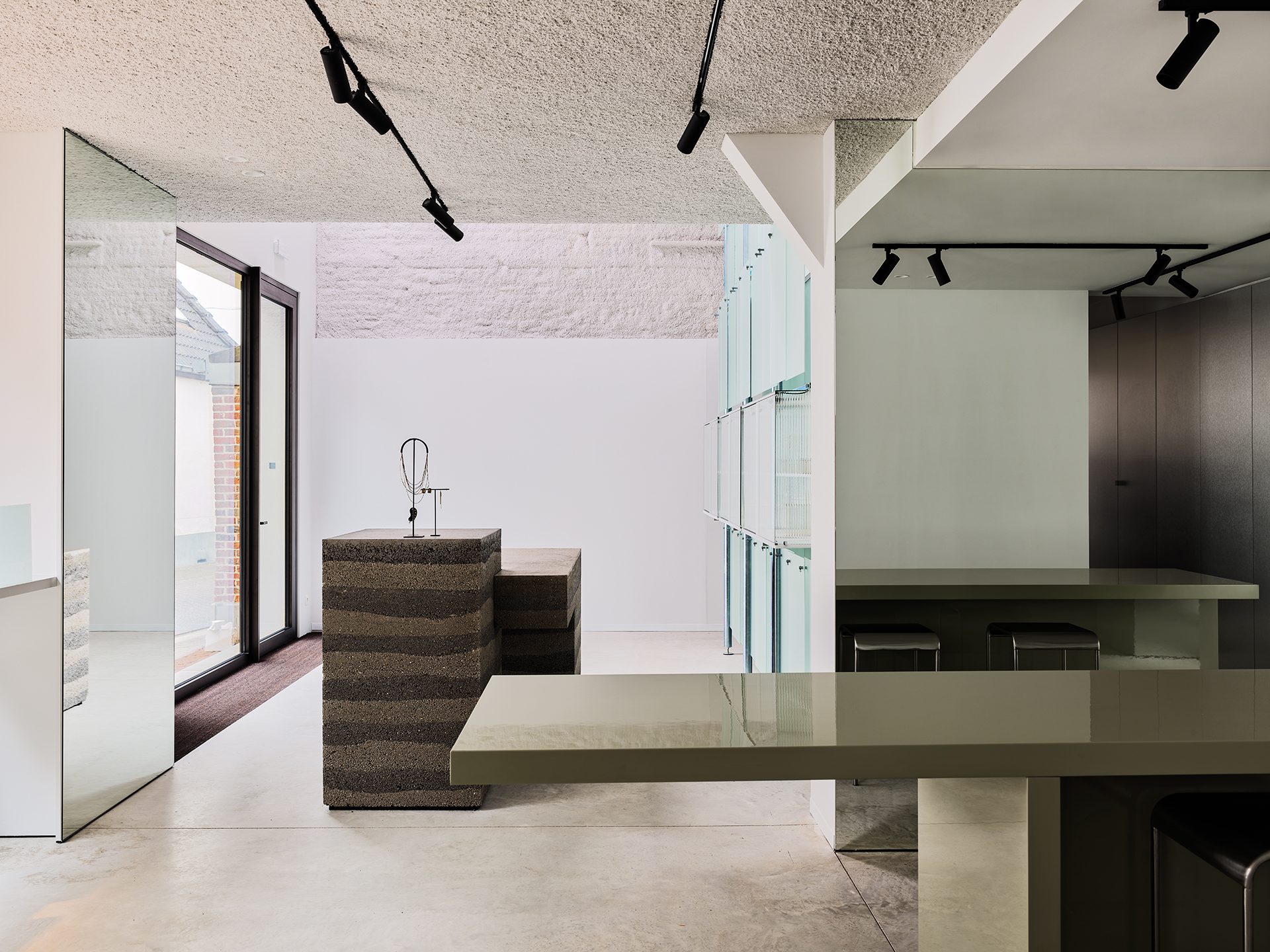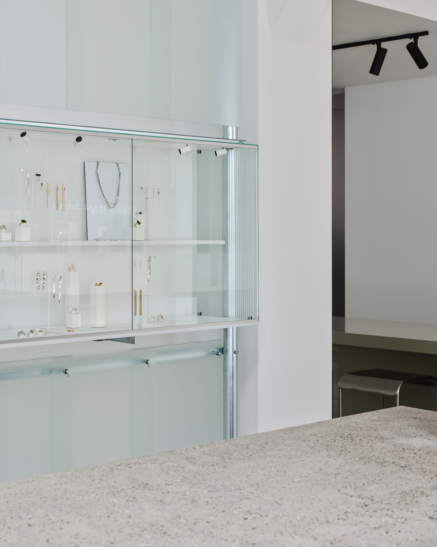 Een strak, minimalistisch interieur met spiegelschuifdeuren die de ruimte optisch groter laten lijken. De lange kastwand in brushed aluminium brengt een tijdloos karakter, dat wordt versterkt door de vele spiegels rondom. Voor het presenteren van juwelen zijn legplankjes voorzien. In de grootste ruimte werd een deels zwevende tafel geplaatst, afgewerkt met hoogglanslak voor een luxueuze uitstraling.