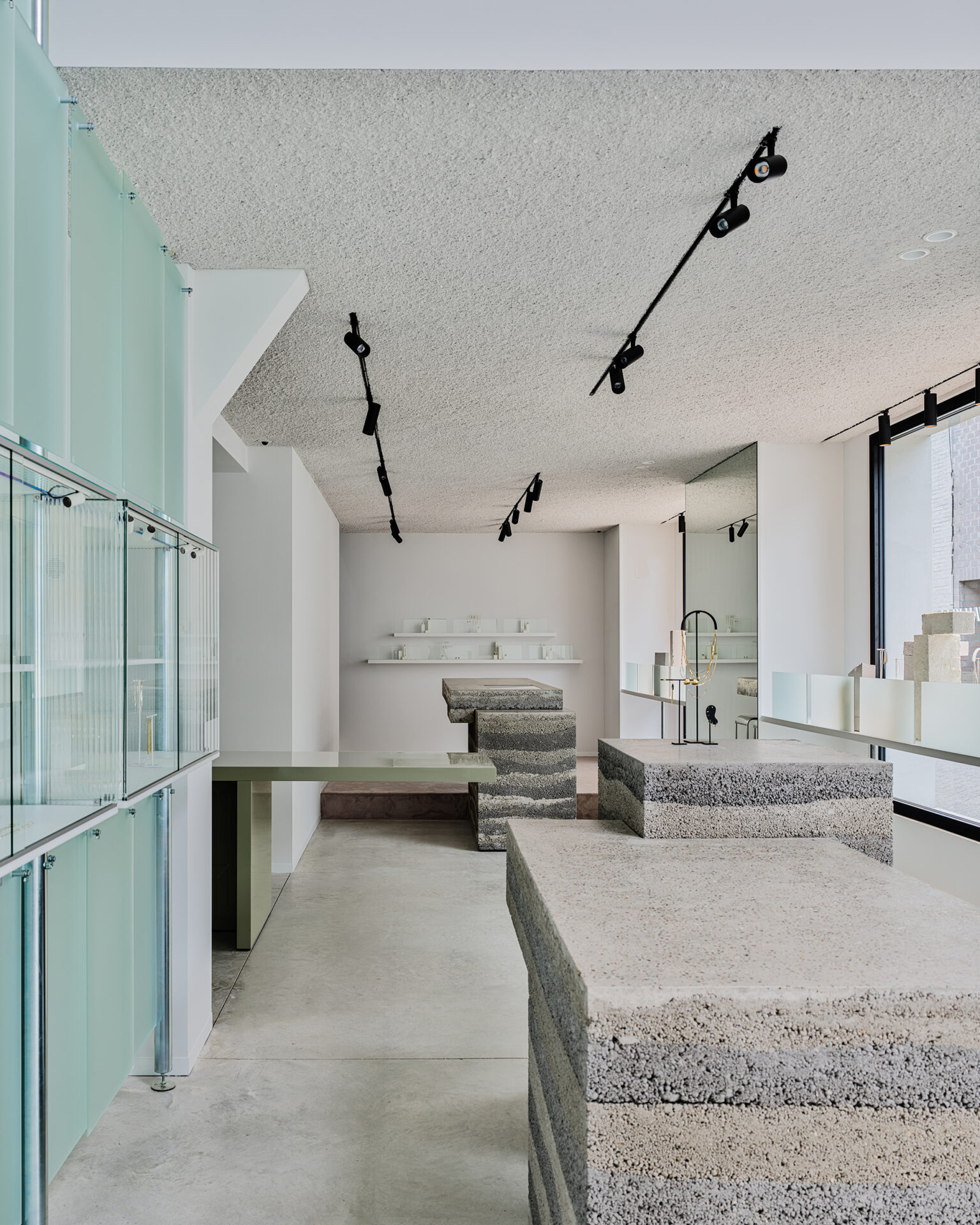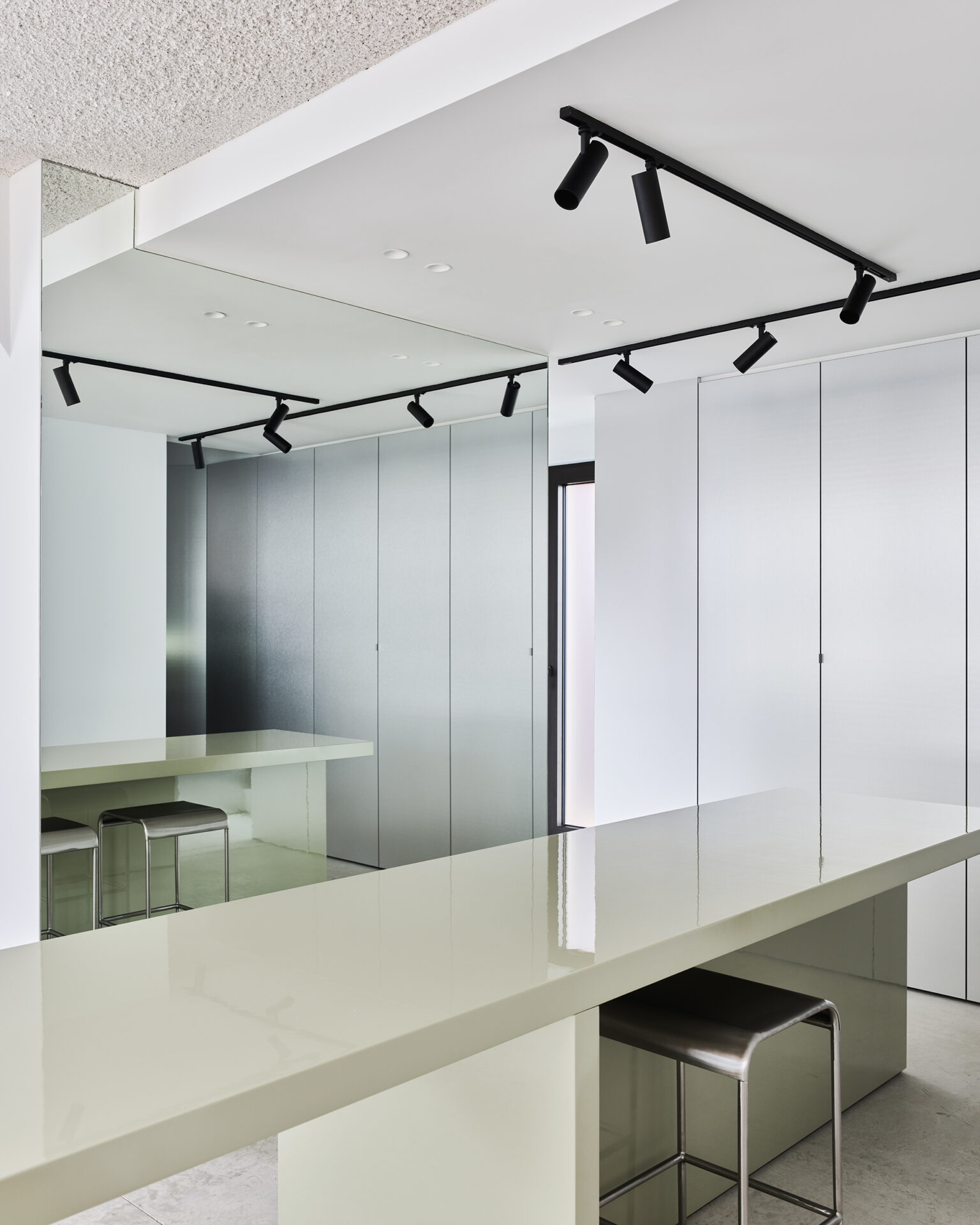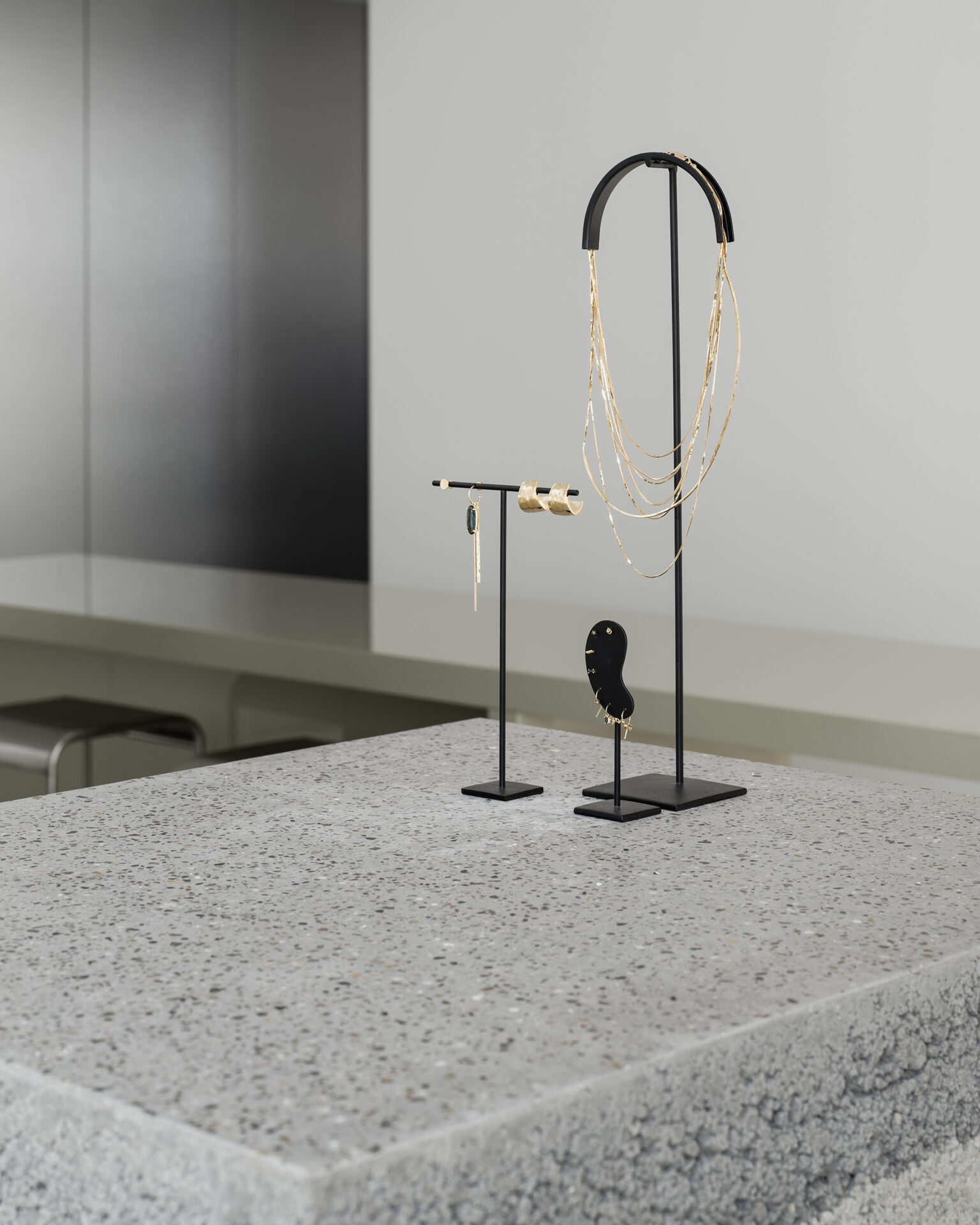 Een strak, minimalistisch interieur met spiegelschuifdeuren die de ruimte optisch groter laten lijken. De lange kastwand in brushed aluminium brengt een tijdloos karakter, dat wordt versterkt door de vele spiegels rondom. Voor het presenteren van juwelen zijn legplankjes voorzien. In de grootste ruimte werd een deels zwevende tafel geplaatst, afgewerkt met hoogglanslak voor een luxueuze uitstraling.